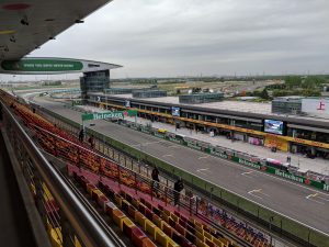 Note that if you sit a bit lower down in the main grandstand, your view of the back part of the track will be obstructed by the pit building.